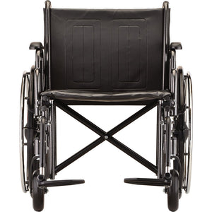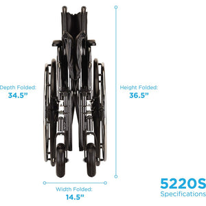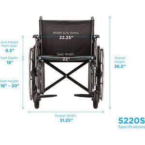 The Steel Wheelchair 22" (5220S) is a robust and versatile mobility solution designed for comfort and convenience. Equipped with detachable and reversible desk arms and swing away footrests, this wheelchair offers excellent adaptability for various user needs. Its dual axle positions allow for quick seat height conversion, while the flame retardant black vinyl upholstery ensures durability and safety.