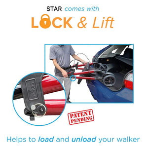 The STAR DX is designed with convenience in mind. It features a convenient handlebar for easy folding and NOVA's patent-pending LOCK & LIFT pin, which keeps the walker securely folded. This makes it much easier to lift in and out of a car or store away when not in use.
